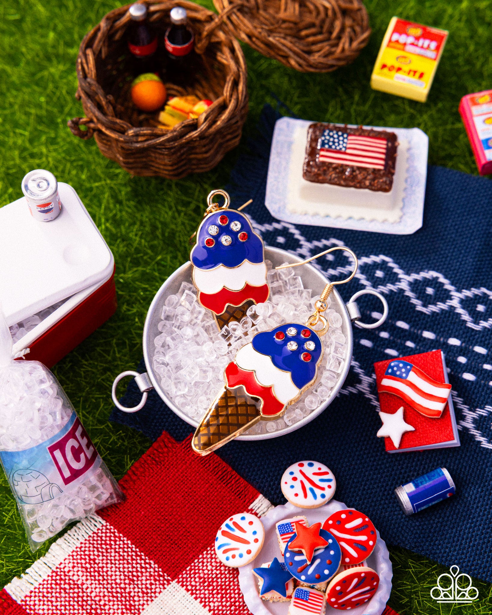 Modeled after sprinkles, a collection of dainty white and red rhinestones shimmer atop a trio of red, white, and blue-painted gold ice cream scoops that are stacked atop a brown waffle-textured cone for a sweet summery lure. Earring attaches to a standard fishhook fitting.