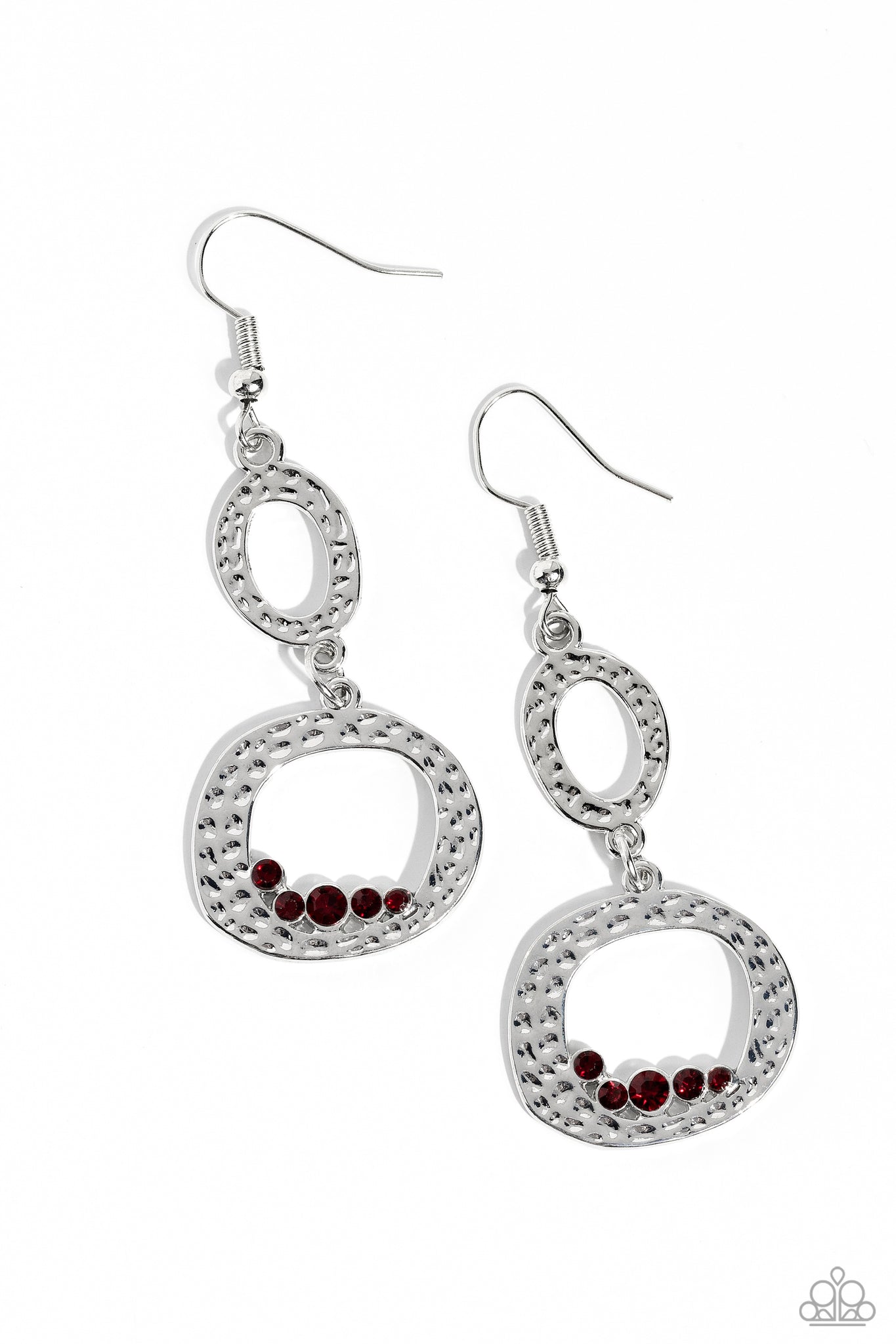 Hammered in shimmery texture, two asymmetrical silver hoops link into an abstract lure. A cluster of glittery red rhinestones collects along the bottom of the lowermost hoop, adding a bubbly effervescence. Earring attaches to a standard fishhook fitting.